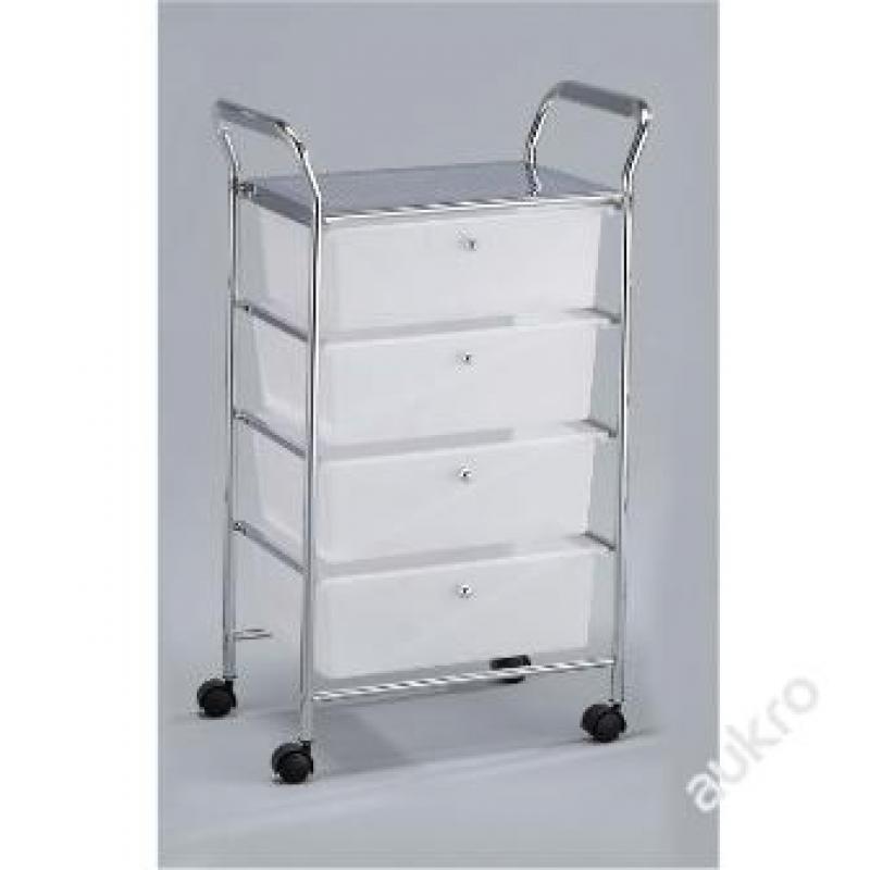 Pojízdný regál se 4 zásuvkami + 1 polička. Materiál: kov (chrom) + plast (mléčná barva). Nylonové kolečka. Rozměry (ŠxHxV): 49,7x30x82 cm. Dodáváno v demontu.