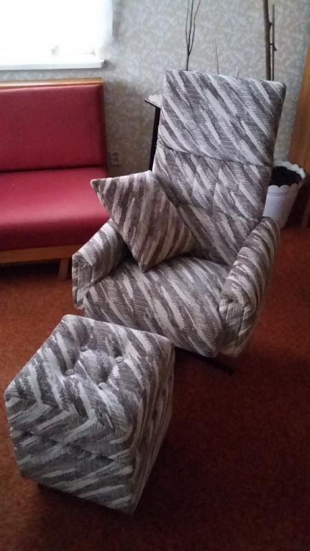 Nabízíme k prodeji velmi pohodlné a zachovalé křeslo na otočné noze s taburetem. K dispozici jsou i dva polštáře v identické barvě. Křeslo i taburet byly cca před dvěma lety znova očalouněny a jsou ve výborném stavu. Taburet je otevírací s úložným prostorem. Mohu zaslat více fotografií.