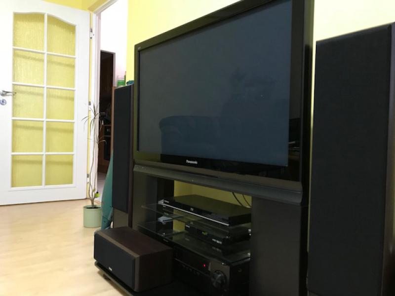 Plazmová TV Panasonic Viera, úhlopříčka 106 cm, rozlišení 1920 x 1080, dokonalý věrný obraz bez vypálených bodů. Výhodou těchto TV je obraz bez posunů a rozmazání, zcela přirozený. Součastí je i TV stolek spojený s touto TV (originální příslušenství v pořizovací hodnotě 5 tis. Kč), stolek má vodící úchyty pro kabely přístrojů. Součástí je také podstavec pro použití jinak než se stolkem. Součástí není reprosoustava na fotografiích.