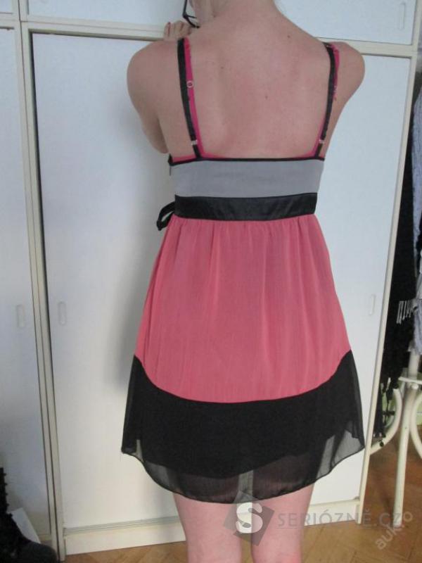 Šaty téměř nenošené. Barva šedá, řůžová, černá, vel.38. Délka 90 cm (měřeno s ramínky , ramínka lze posunovat na upravení délky).