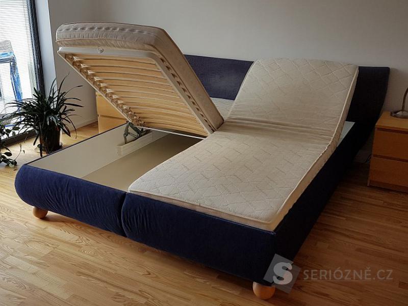 Používaná manželská postel v prodloužené velikosti 180 x 220 cm. Postel je s úložným prostorem a polohovatelným lamelovým roštem (hlavová i nožní část) pro matraci o rozměru 90 x 220 cm, které jsou součástí jsou dodávky. Jedná se o latexové matrace s jádrem z latexové pěny s výškou jádra 12 cm. Součástí je také textilní přehoz včetně dvou dekoračních polštářů. Vše je zobrazeno na obrázcích. Postel se dá rozložit na díly pro snadnou přepravu. Vzhledem k velikosti nábytku požaduji pouze osobní odběr.