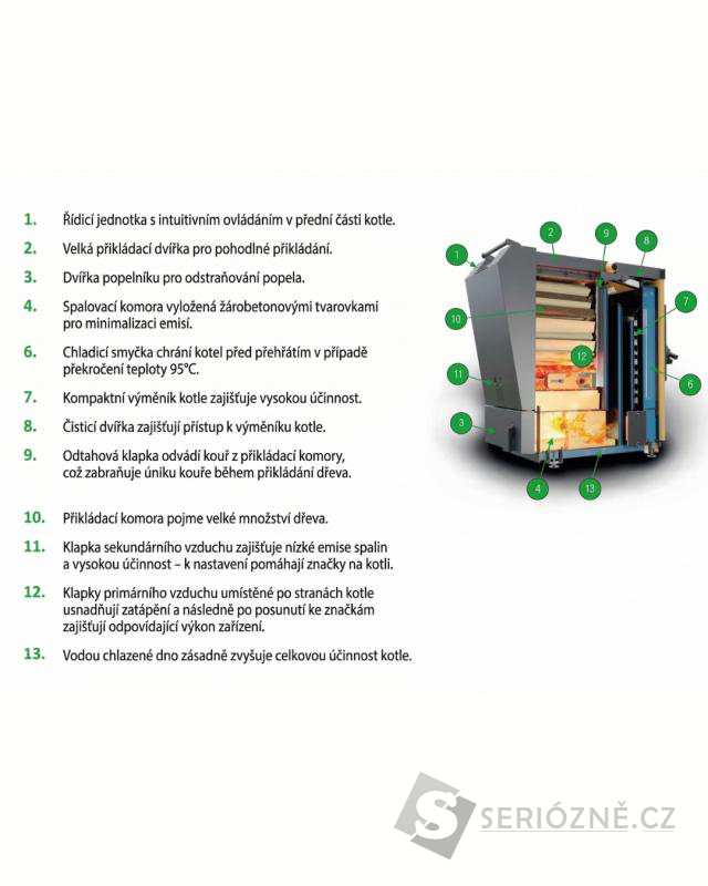 Náplňová komora pojme 42 až 82 litrů dřeva o délce 33–40 cm, v závislosti na modelu kotle.