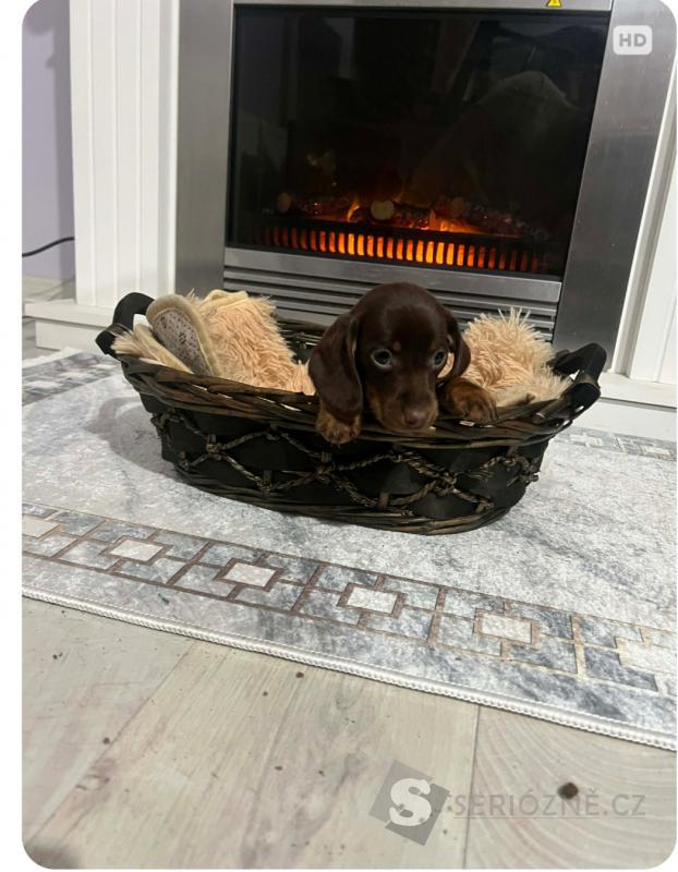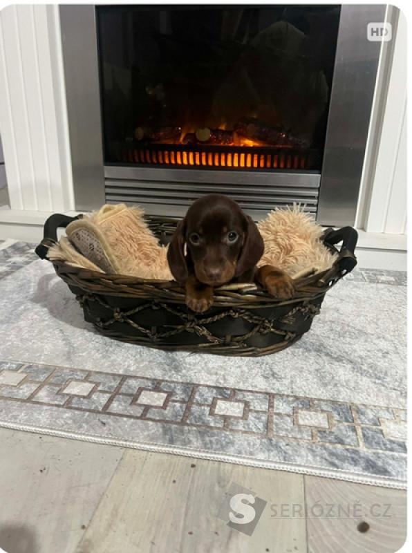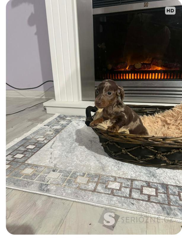 Trpasličí krátkosrstí jezevčíci Extra Mini, 3x očištěni od parazitů, mají dvě vakcíny. Každé štěně je dodáváno s čipem, pasem, klinickou prohlídkou u veterináře, počátečním balením granulí a rodokmenem.