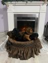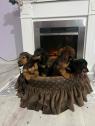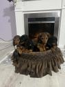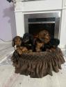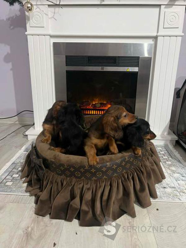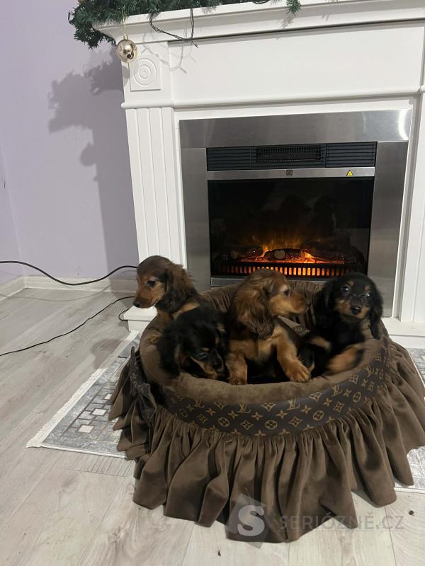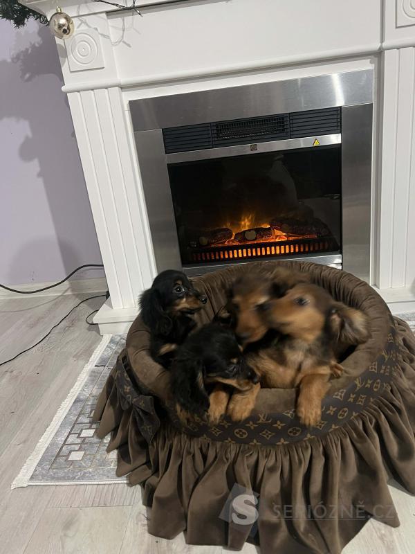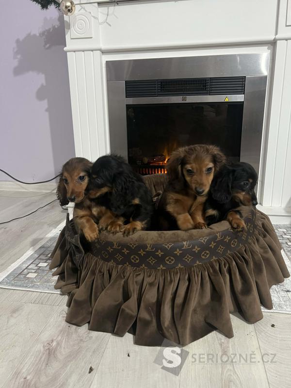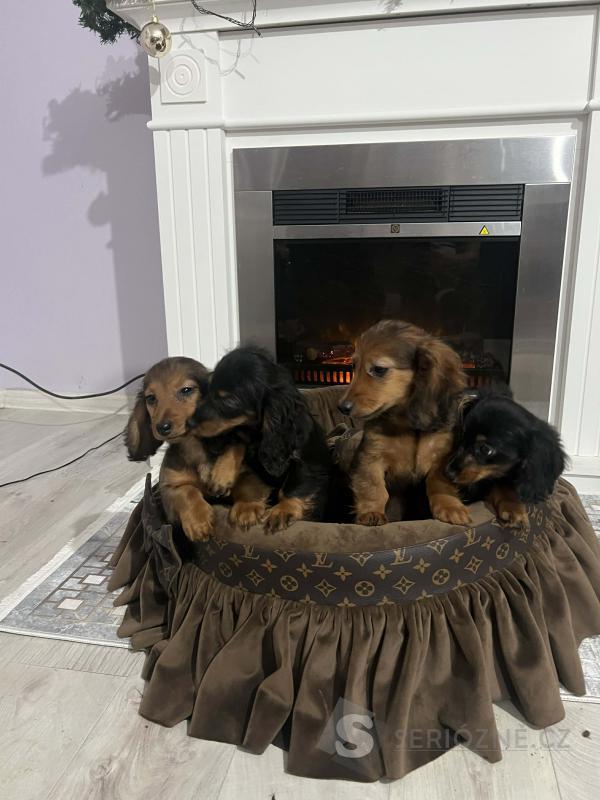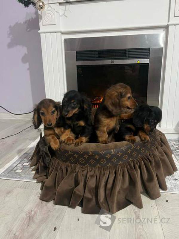 Štěňata dlouhosrstého zakrslého jezevčíka, devět týdnů stará, 3x odčervená, dvakrát očkovaná. Každé štěně má čip, pas, klinickou prohlídku u veterináře, počáteční balení granulí a rodokmen.